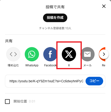 ③Xに「動画URL」が張り付けられます。これで「ポストするボタン」をクリックすると、Xへの「PV動画URL」の埋め込みが完了です。