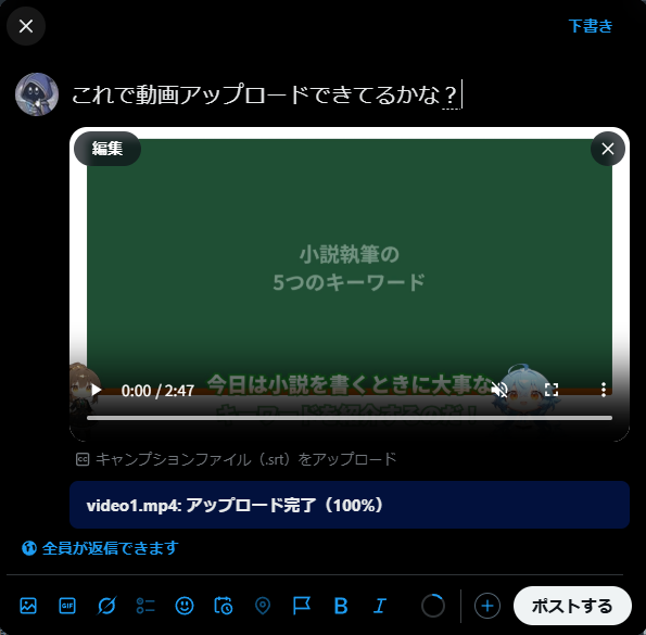まずはXでポストに動画を埋め込む方法を説明します。