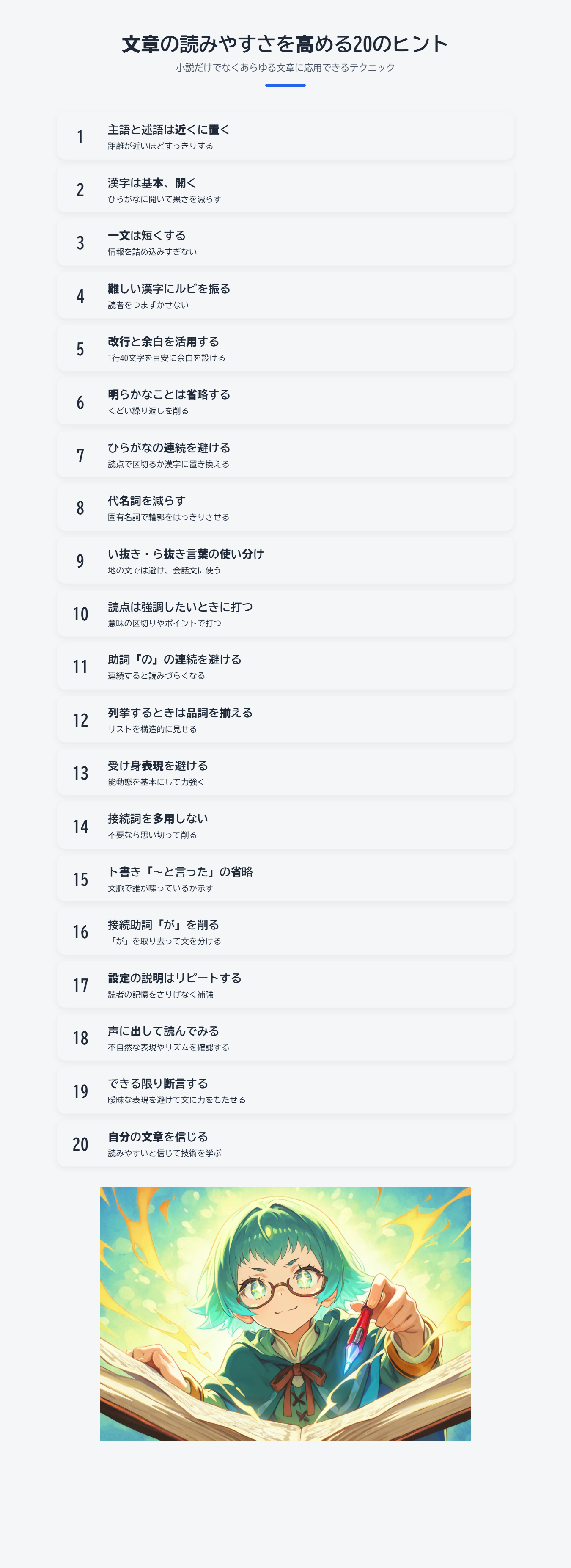 推敲の際にとくに意識したい、読みやすい文章を書くためのヒントを20個にまとめました。小説だけでなく、あらゆる文章に応用できるテクニックです。