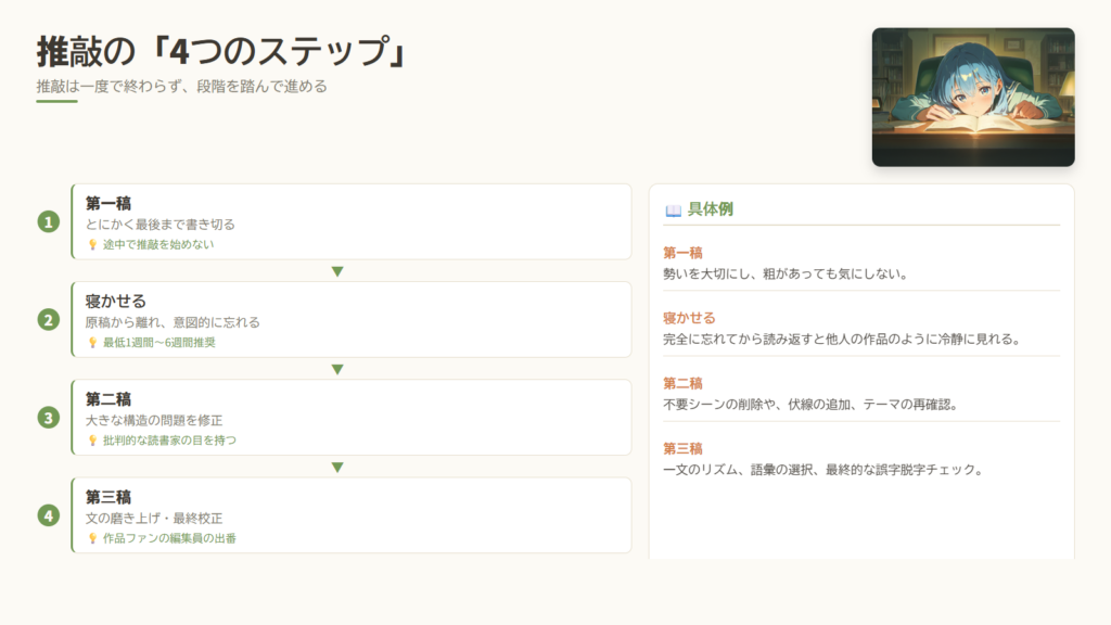 | 寝かせる期間 | 原稿から完全に離れる | なし(忘却が仕事) | 短編1週間〜長編6週間 |