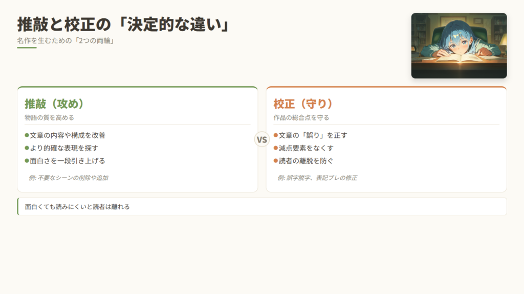 推敲と校正は混同されがちですが、実は別の作業です。整理しておきましょう。